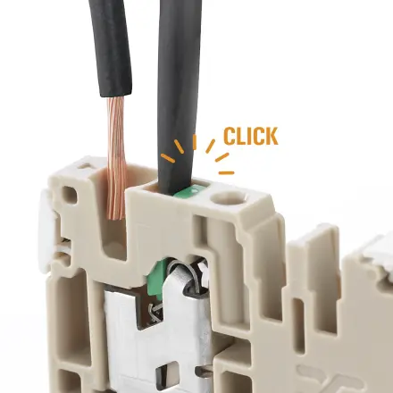 The conductor is contacted in the clamping point with a clear click. The triggered contact point is also signalled visually by an increase in the pusher height.